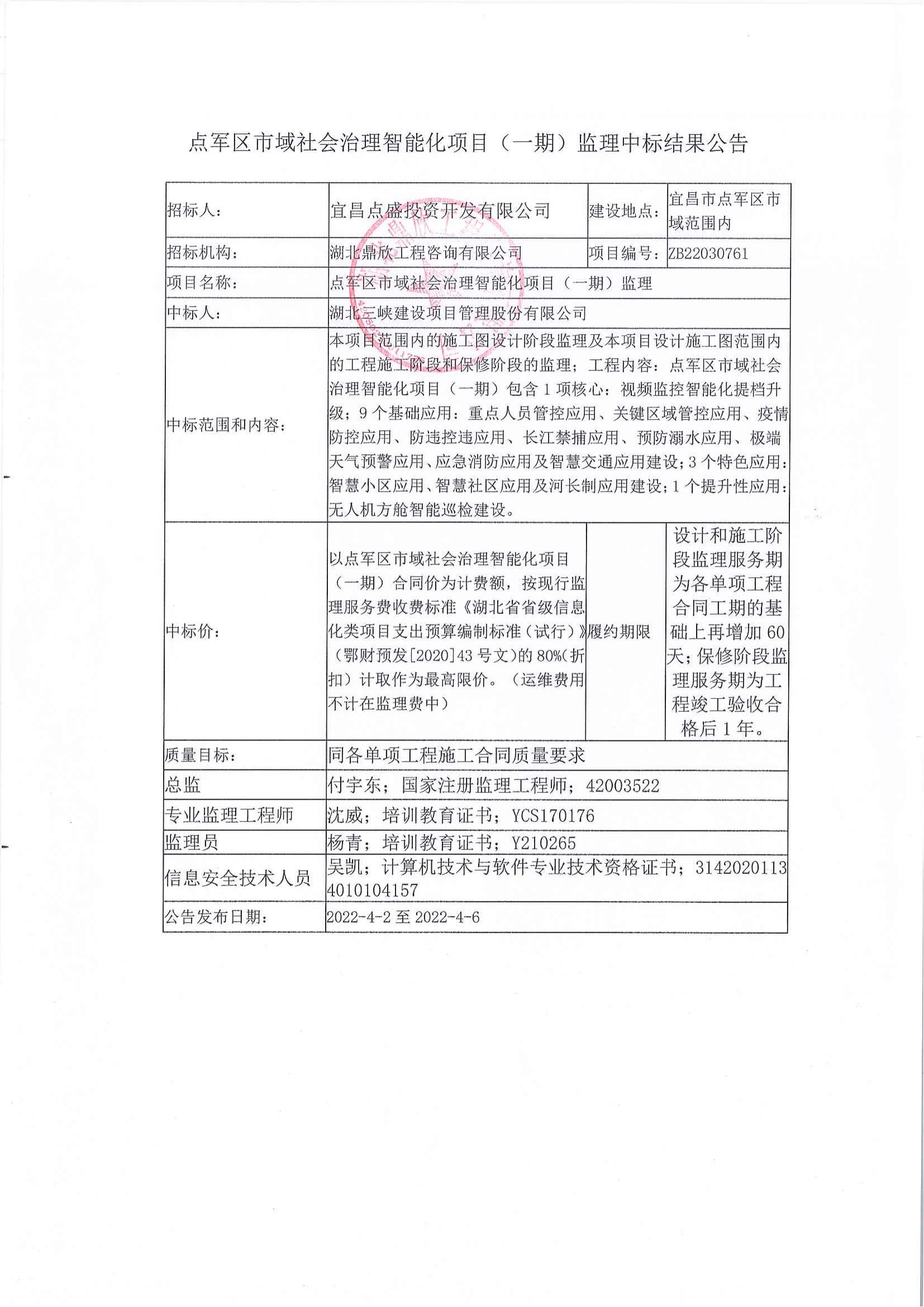 點(diǎn)軍區(qū)市域社會(huì)治理智能化項(xiàng)目(一期)?監(jiān)理中標(biāo)結(jié)果公告