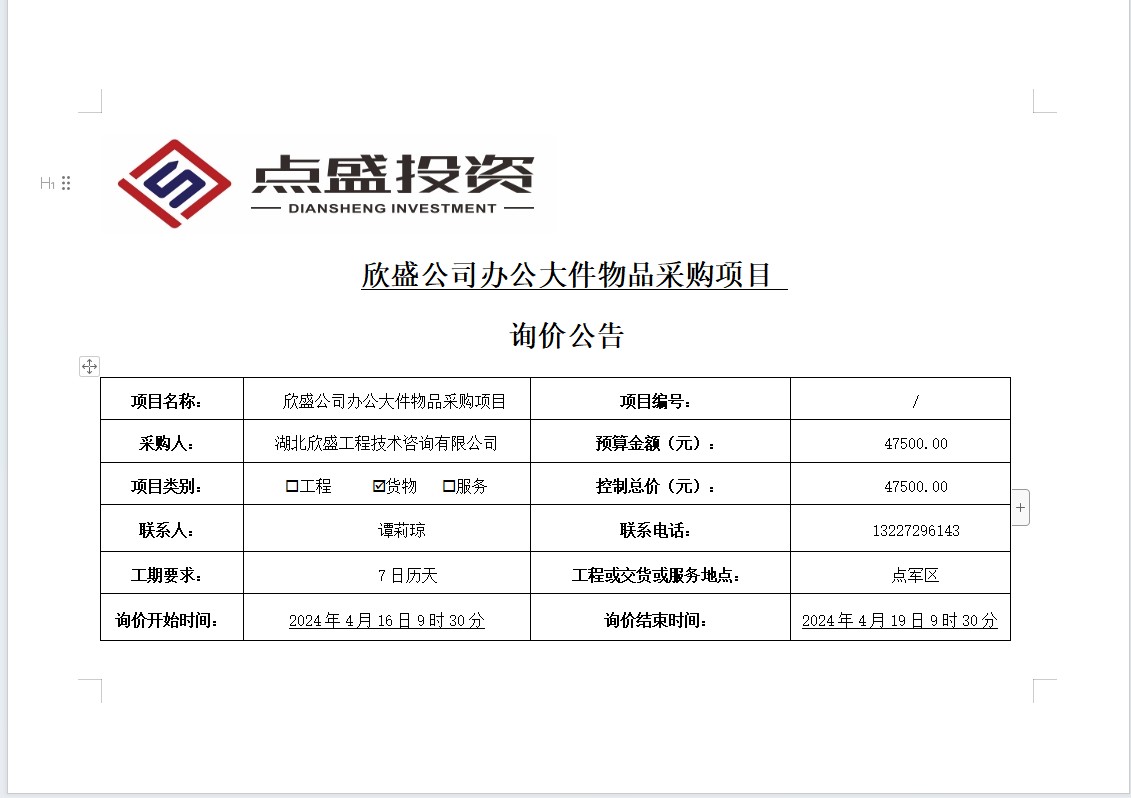 欣盛公司辦公大件物品采購項目詢價公告