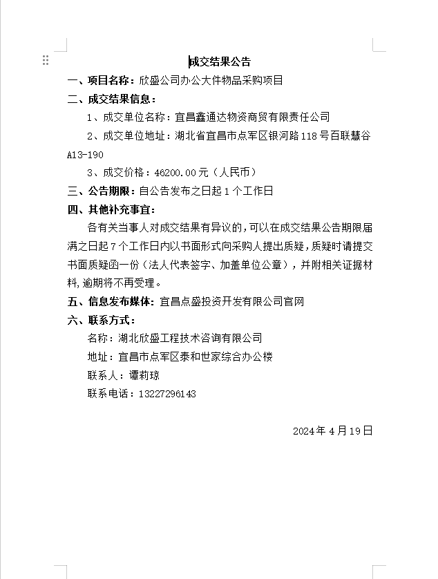 欣盛公司辦公大件物品采購項目成交公告