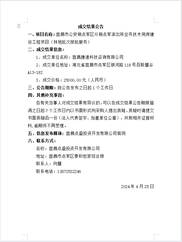 宜昌市公安局點(diǎn)軍區(qū)分局點(diǎn)軍派出所業(yè)務(wù)技術(shù)用房建設(shè)工程項(xiàng)目 (林地批次報批服務(wù))成交公告