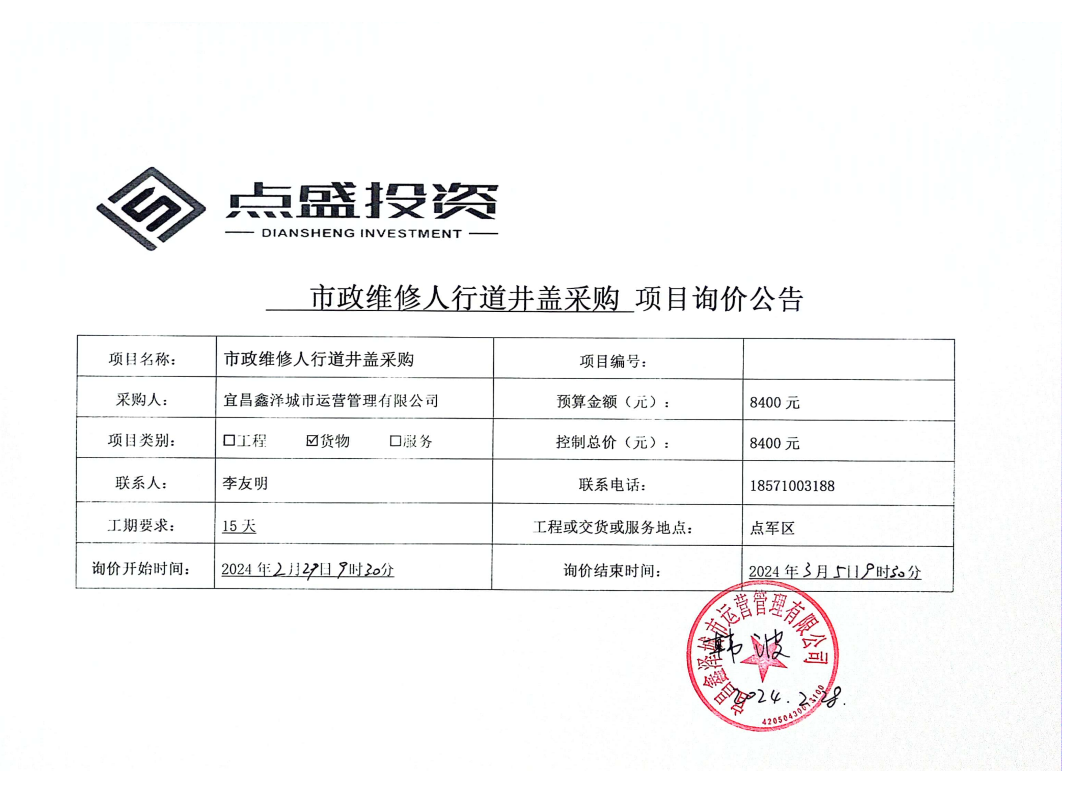 宜昌鑫澤城市運營管理有限公司市政維修人行道井蓋采購項目詢價公告