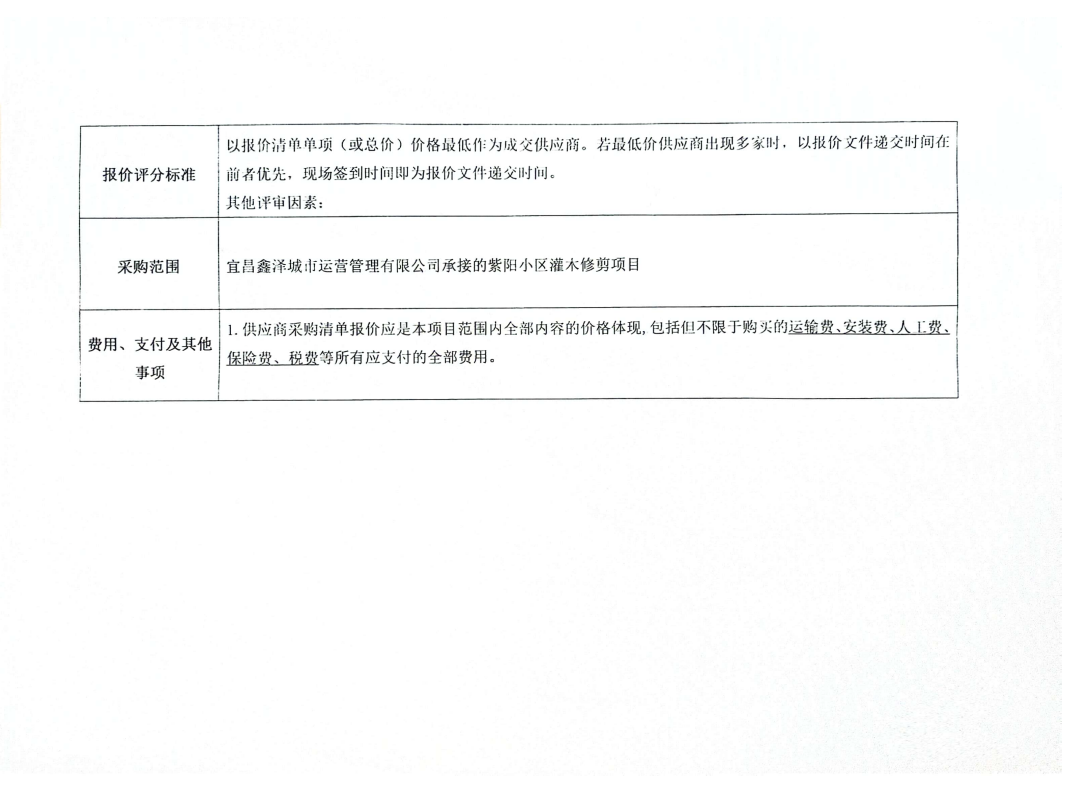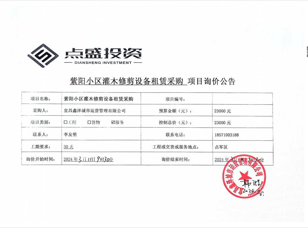 宜昌鑫澤城市運(yùn)營管理有限公司管紫陽小區(qū)灌木修剪設(shè)備租賃采購項(xiàng)目詢價(jià)公告