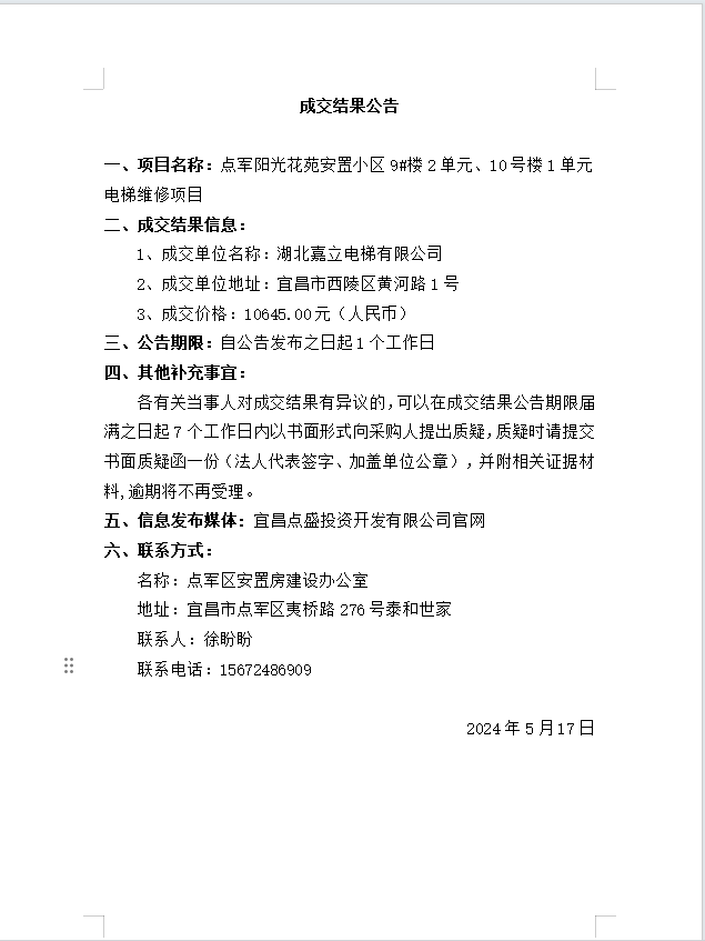 點(diǎn)軍陽(yáng)光花苑安置小區(qū)9#樓2單元、10號(hào)樓1單元電梯維修項(xiàng)目成交公告