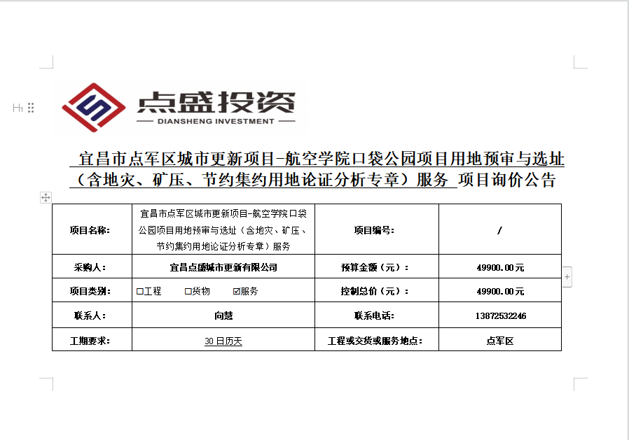 宜昌市點(diǎn)軍區(qū)城市更新項(xiàng)目-航空學(xué)院口袋公園項(xiàng)目用地預(yù)審與選址(含地災(zāi)、礦壓、節(jié)約集約用地論證分析專章)服務(wù)詢價(jià)公告