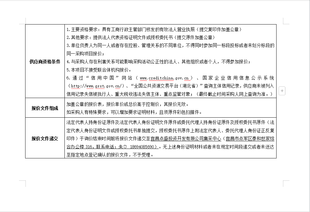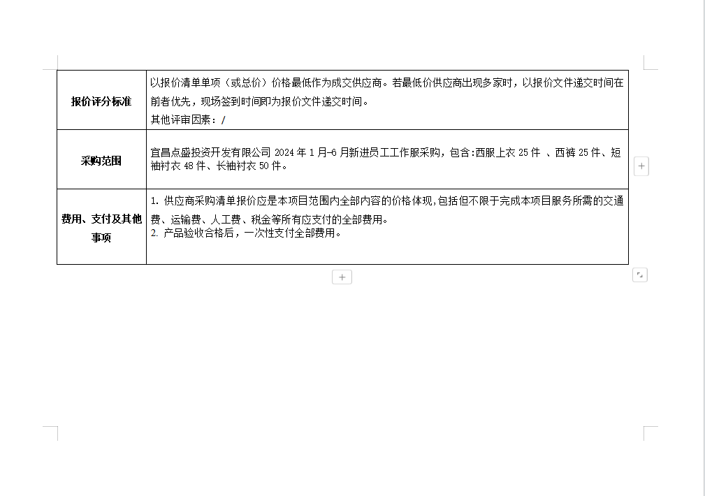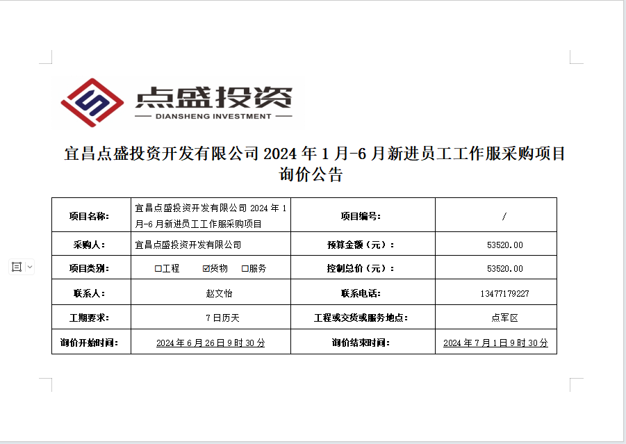 宜昌點(diǎn)盛投資開(kāi)發(fā)有限公司2024年1月-6月新進(jìn)員工工作服采購(gòu)項(xiàng)目詢價(jià)公告
