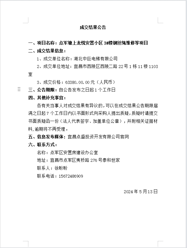 點(diǎn)軍塘上龍悅安置小區(qū)3#樓鋼絲繩維修等項(xiàng)目成交公告