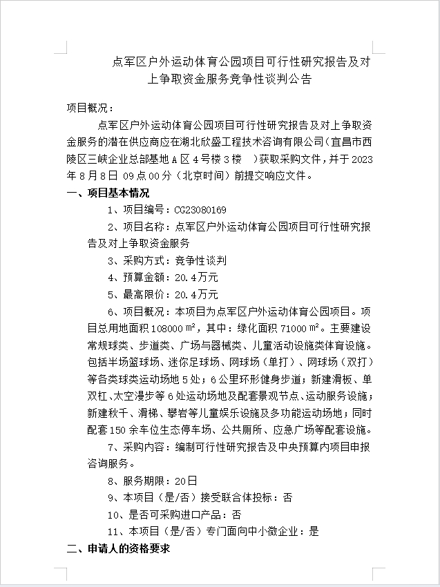 點軍區(qū)戶外運動體育公園項目可行性研究報告及對上爭取資金服務(wù)談判公告